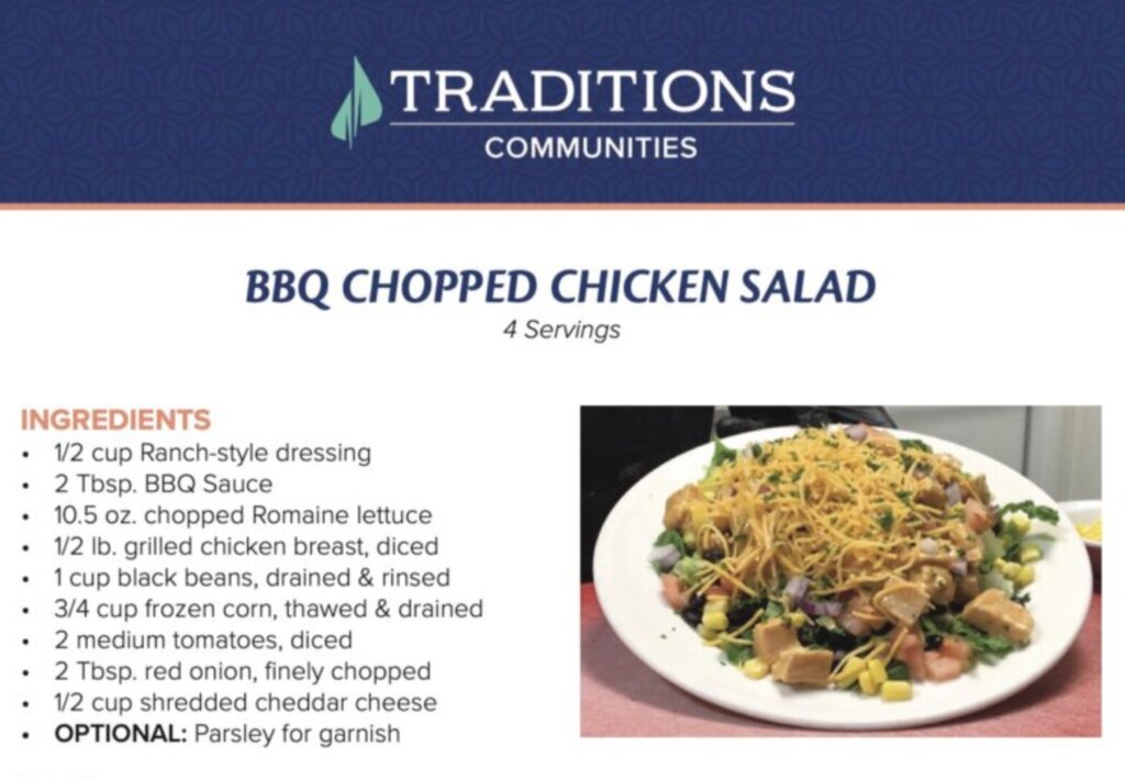 Check out this fun spring recipe for BBQ Chopped Chicken Salad. One of the amazing meals being served in Traditions communities.
