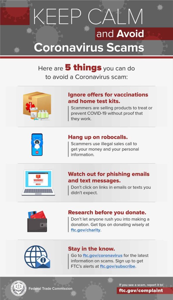 Scammers can even make it appear as if the message is coming from someone you know, including the Centers for Disease Control (CDC) or World Health Organization (WHO). So if you’re unsure, check with that person before clicking a link, or use sites like coronavirus.gov and usa.gov/coronavirus to get the latest information.