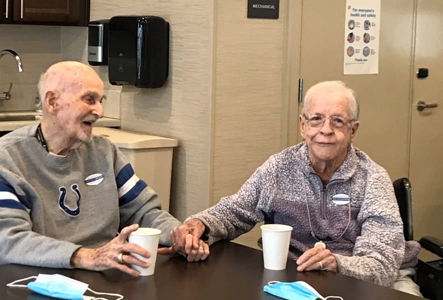 Billie and Gene Evans celebrated their 61st Anniversary on August 14th this past year. The two met at Union Hospital in Terra Haute. Gene was a student at Indiana State and Billie was an employee at Union Hospital where Gene also worked. After these wonderful 61 years together, Gene said his favorite thing about Billie is her patience with him. Their favorite thing to do together was travel. They have gone to many different places including France and England. Billie and Gene went on to have four beautiful children together. Today they love to relax and watch TV together and Gene enjoys singing Billie’s favorite songs to her during our Happy Hour.